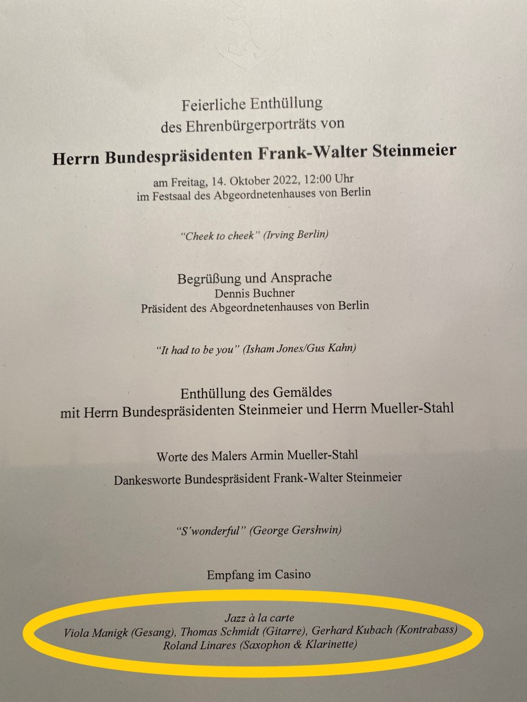 14.10.2022 – Schöner Event im Abgeordnetenhaus von Berlin: Enthüllung des von Armin Müller-Stahl gemalten Porträts Frank Walter Steinmeiers (Ehrenbürger der Stadt). Hatten die Ehre der Programm-Begleitung mit „Jazz a lá Carte“, diesmal mit der hervorragenden Viola Manigk (voc.), und natürlich Roland Linares (clar/sax), Thomas Schmidt (guit) und Kubi Kubach (bass).